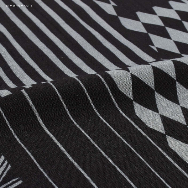 黒とわずかに青みのグレーで表現された四角い切り嵌めのようなたくさんの幾何学柄。麻の葉文様や乱調の縞、ピンストライプ、ハーリキンチェックなど。三角形がアクセントとなっています。