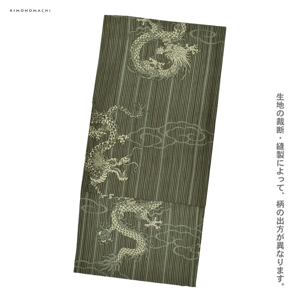 グレイッシュな黄緑の地に濃い抹茶色の細い乱れ縞。その上に、地色と同系色の線で表現された雲に白緑色の体の龍。