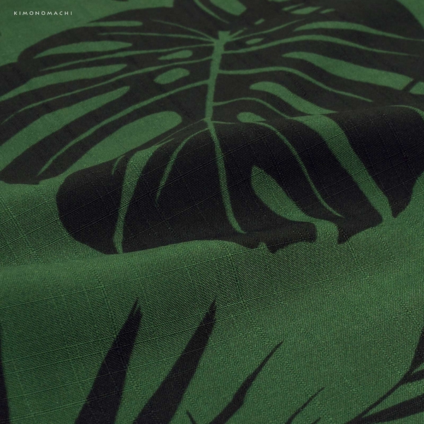 くっきりとした深緑の地に、黒で全体に表現された椰子(ヤシ)や棕櫚(シュロ)、オーガスタ、モンステラなど南国植物の葉。
