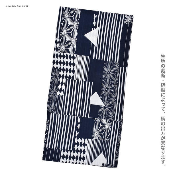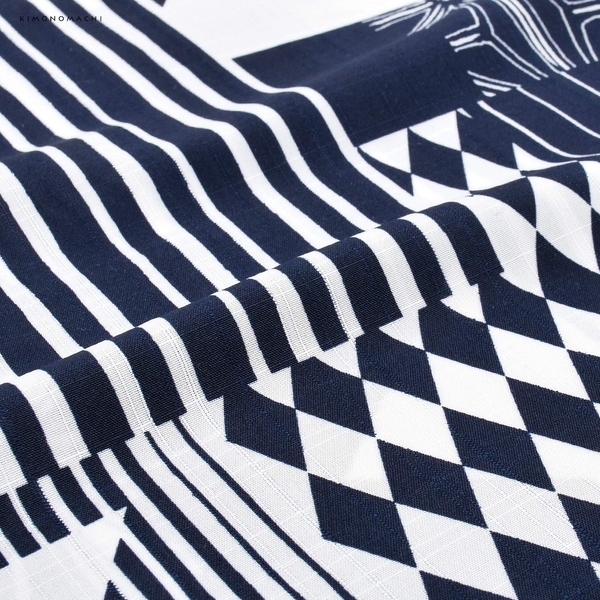 紺と白で表現された四角い切り嵌めのようなたくさんの幾何学柄。麻の葉文様や乱調の縞、ピンストライプ、ハーリキンチェックなど。白い三角形がアクセントとなっています。