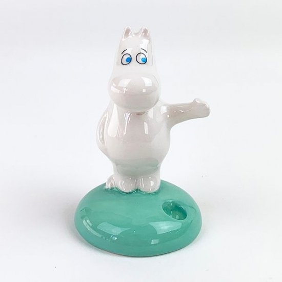 磁器製でツヤ感のある、ムーミンのペンスタンドです。片手を横に広げたポーズで、いつでもペンをホールドするスタンバイ中♪台座もナチュラルなグリーンで、お部屋やデスクにも馴染みます。