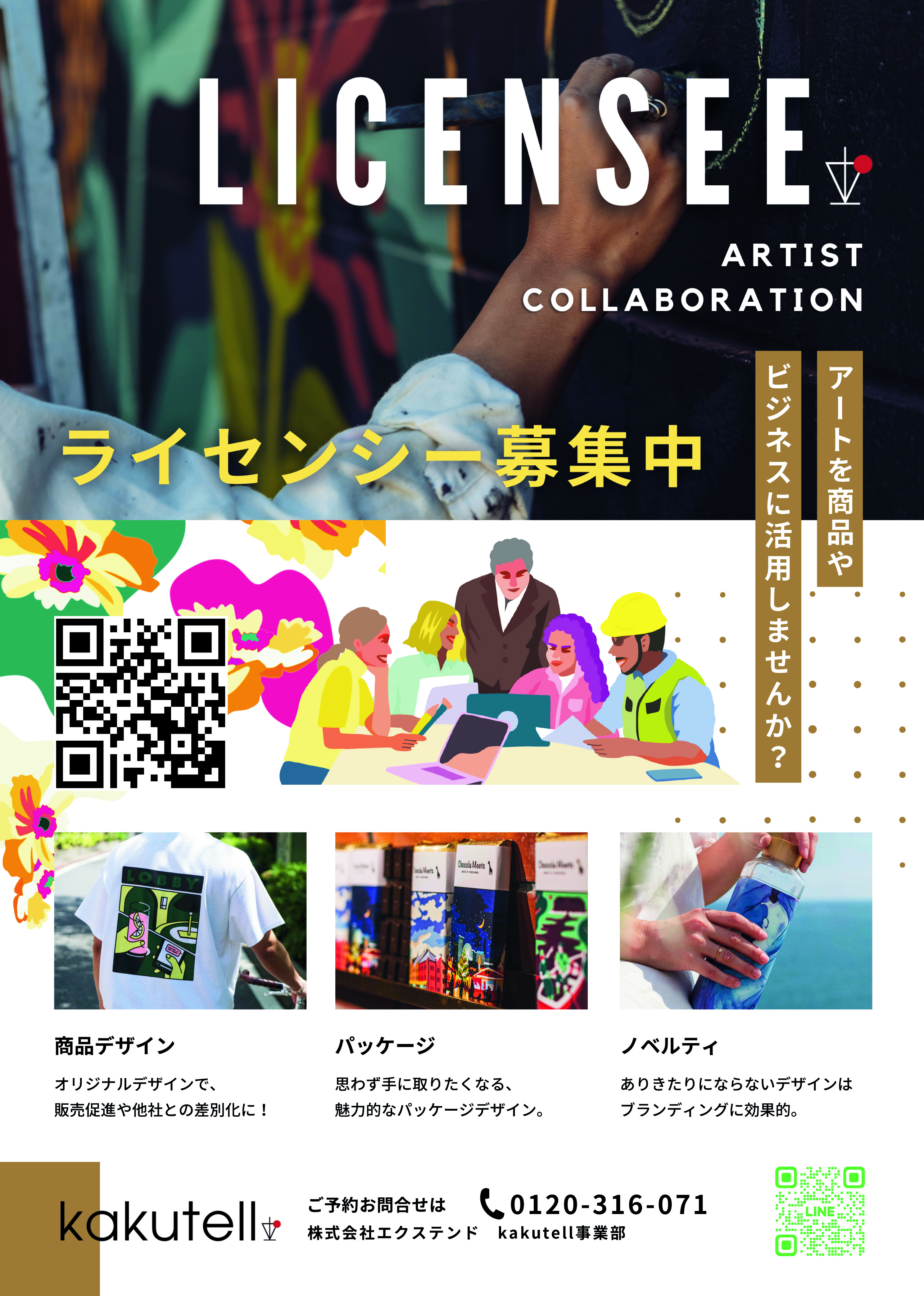 数十名のアーティストをマネジメントしている株式会社エクステンドkakutell事業部は、魅力的なアートと商品のコラボレーションを皆様にご提案いたします。