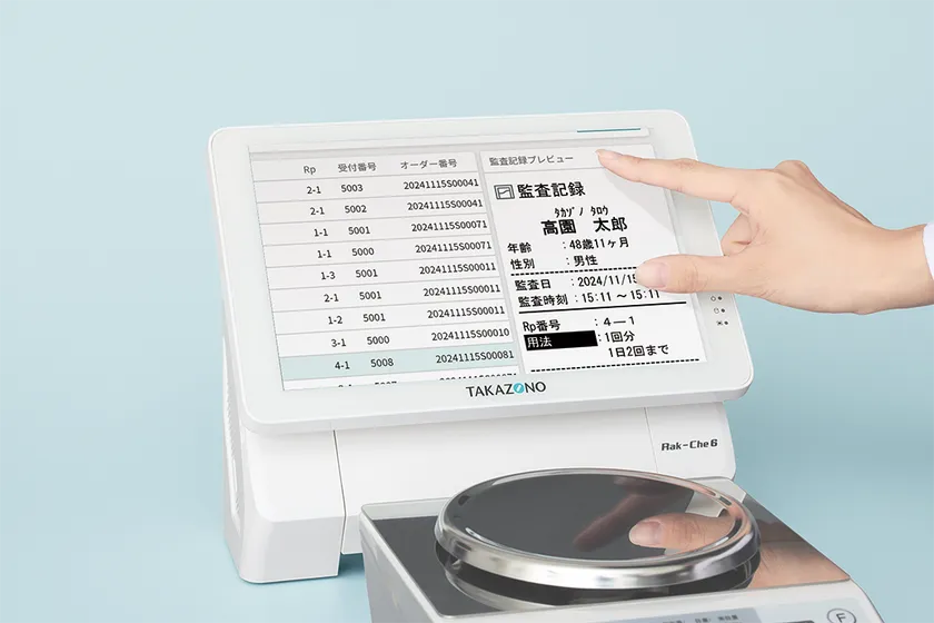 「調剤監査支援システム Rak-Che 6」は、散剤・水剤・外用剤・錠剤(粉砕)などの薬品チェックや計量を支援するシステムです。タカゾノの長年のノウハウと現場薬剤師の意見をもとに改良され、調剤時に起こりうるヒューマンエラーを防止します。誰にでも使いやすいユーザーインターフェースで業務効率を向上させ、患者様と向き合う時間の創出を実現します。