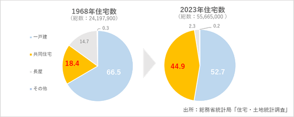 総務省統計局の住宅・土地統計調査によると、1968年には全住宅に占める共同住宅の割合が18.4%だったのに対し、2023年には44.9%まで増加しています。
