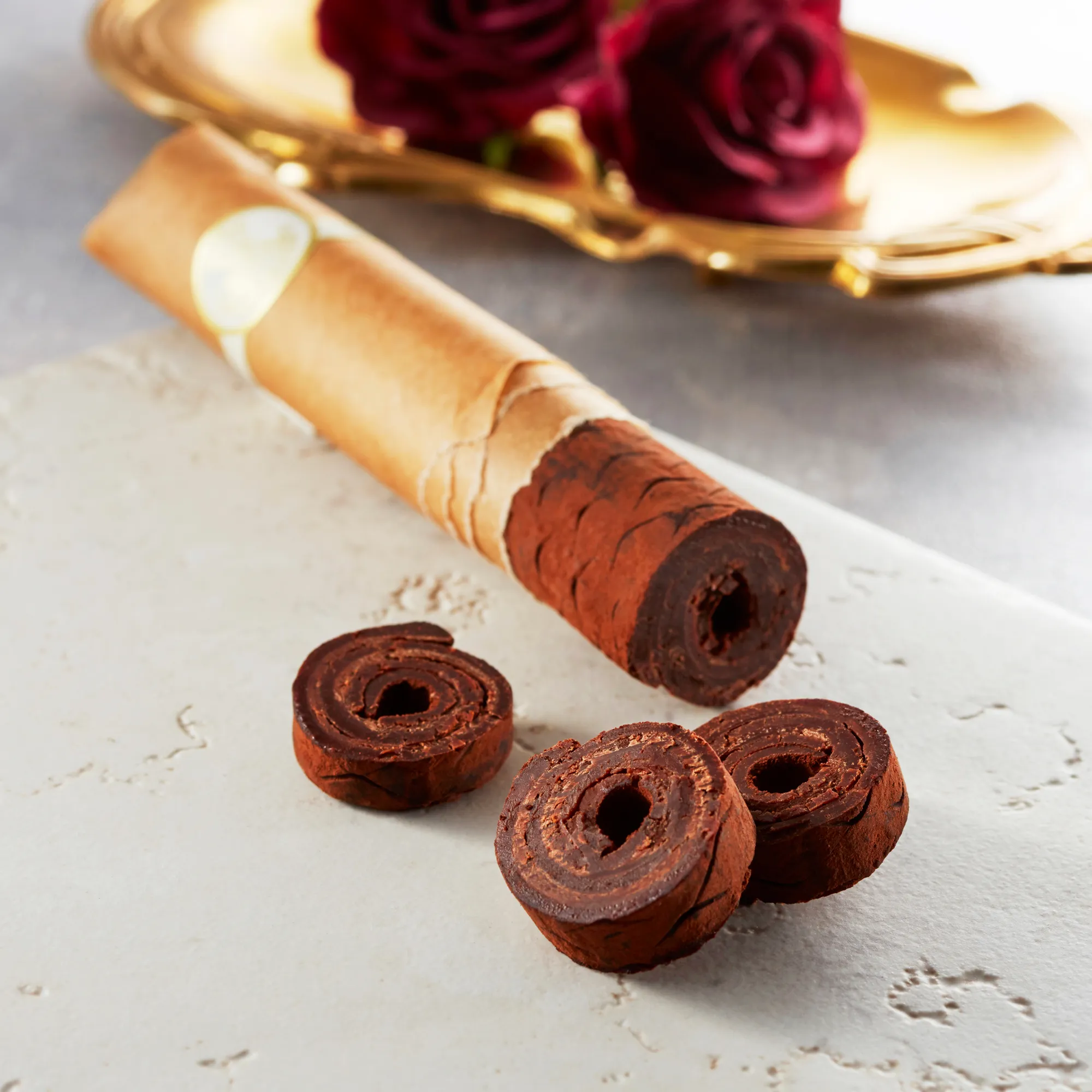 職人が巻き上げる葉巻ショコラは、生クリームを使わずお酒のみを使用。