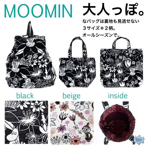 お花に囲まれたムーミンのデザインが、大人カワイイシリーズです♪ちょっとした外出にもピッタリなサイズ感が揃いました。