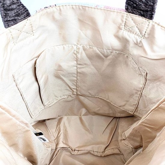 ベージュの背景に、ピンクやオレンジのお花に囲まれたリトルミィのデザイン。大人っぽい雰囲気の中にもかわいらしさが詰まったバッグです。