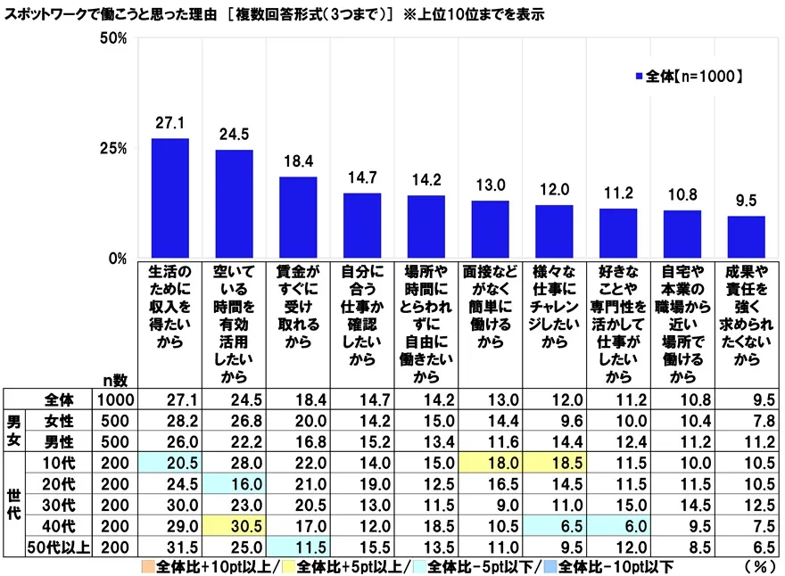 世代別にみると、10代では「面接などがなく簡単に働けるから」(18.0%)と「様々な仕事にチャレンジしたいから」(18.5%)、40代では「空いている時間を有効活用したいから」(30.5%)が全体と比べて5ポイント以上高くなりました。
