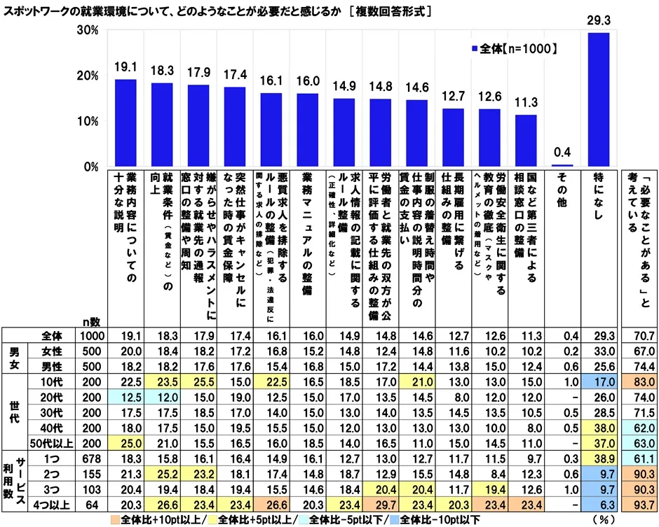 最後に、全回答者(1,000名)に、スポットワークの就業環境について、どのようなことが必要だと感じるか聞いたところ、「業務内容についての十分な説明」(19.1%)が最も高くなりました。短期間の単発的な仕事だとしても、丁寧な説明を望む人が多いことがうかがえます。次いで高くなったのは、「就業条件(賃金など)の向上」(18.3%)、「嫌がらせやハラスメントに対する就業先の通報窓口の整備や周知」(17.9%)、「突然仕事がキャンセルになった時の賃金保障」(17.4%)、「悪質求人を排除するルールの整備(犯罪・法違反に関する求人の排除など)」(16.1%)でした。