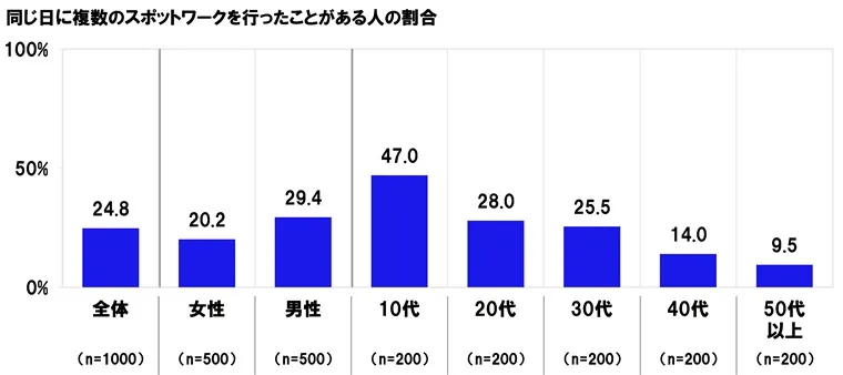 また、同じ日に複数のスポットワークを行ったことがあるか聞いたところ、行ったことがある人の割合は24.8%となりました。
