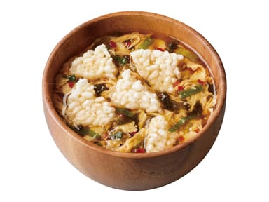 かつおだしにしょうがを効かせた和風仕立てのスープとピリリと刺激的な韓国風スープに香ばしい味わいのおこげをプラスして、小腹を満たしてくれるサクもち食感のスープを開発いたしました。