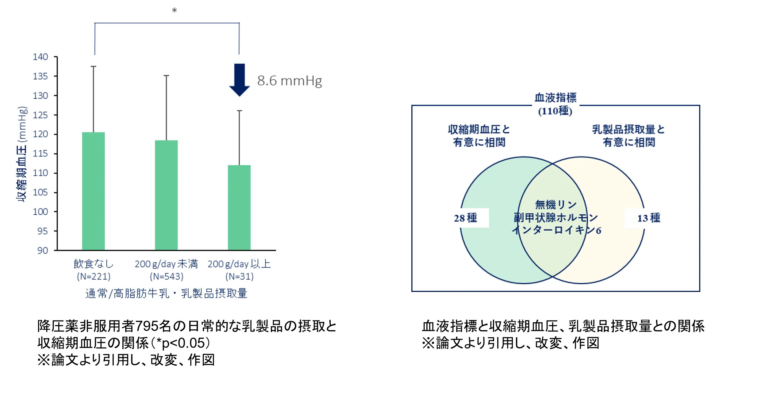 これらの結果より、日本人のような高塩分摂取、低乳製品摂取集団において日常的な牛乳・乳製品摂取は、収縮期血圧の上昇を抑制し、高血圧リスクを低下させることが示された。
