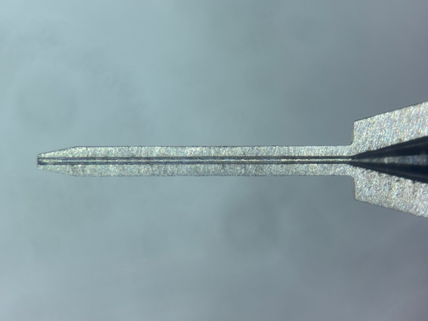 本製品の最大の特長は、穴径0.1mm、先端長さ4mmの深穴先端。周辺部品に接触することなく、深部への精密塗布が可能になる。精密ノズルの一般的な限界値(穴径比10倍)や、従来当社最高スペック(穴径比24倍)を大幅に更新し、「穴径比40倍」の深穴精密ノズルの開発に成功した。