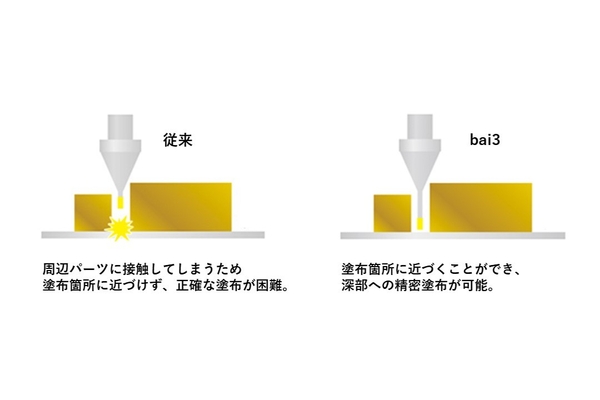 AIや自動運転など、次世代技術を支える電子デバイスは、更なる高機能化が求められている。これに伴い、微細な部品が密集する奥深い箇所への接着剤の塗布が新たな課題となり、「深部への精密塗布」の解決が急務となっていた。