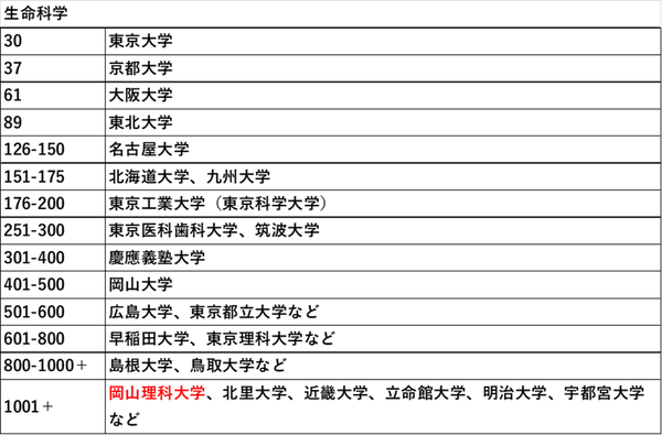 岡山理科大学がランクインした「物理科学分野」では、物理学、化学、数学、天文学、地質学、環境・地球学など、「生命科学分野」では、獣医学、生物科学などの主要分野で大学が評価されます。