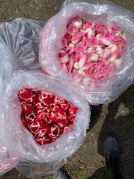 最初に農園スタッフの説明を聞き、きれいに咲いたチューリップの花を花首で摘み取り、袋に入れていく作業を約1時間半体験しました。農家から摘み取りのポイントやチューリップ生産について説明を受けながら袋いっぱいに摘花。摘み取り終了後には、プレゼント用のチューリップ10本をじっくり選び摘み取りました。球根用のチューリップは4月に摘み取り後、栄養を蓄え6月に掘り起こされ、秋にまた翌年用に植え込みを予定しています。この日の参加者には、植え込み時期の秋に球根もプレゼントされます。参加者は初めての体験に、「腰が痛くなり農家さんの苦労がわかった」「とても楽しい体験ができ他の人にもすすめたい」「最後に自分で選んだ摘みたてチューリップも頂けて素敵なご褒美をもらえた」「来年もまた参加したい」と笑顔で感想を述べました。