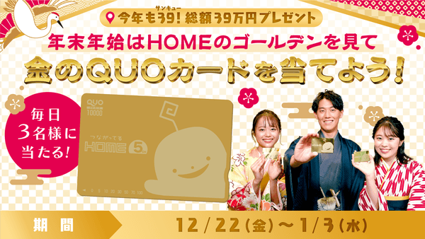 「今年も39!」総額39万円が当たる!年末年始はHOMEのゴールデンみて金のQUOカード当てよう