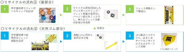 今回の実証実験で使用するジェット風船の空気注入(笛)部分には、阪神甲子園球場のオフィシャルエコパートナーである帝人フロンティア株式会社の協力を得て開発した、ペットボトルキャップの再生原料(阪神甲子園球場で回収したペットボトルキャップも一部使用)を使用しています。