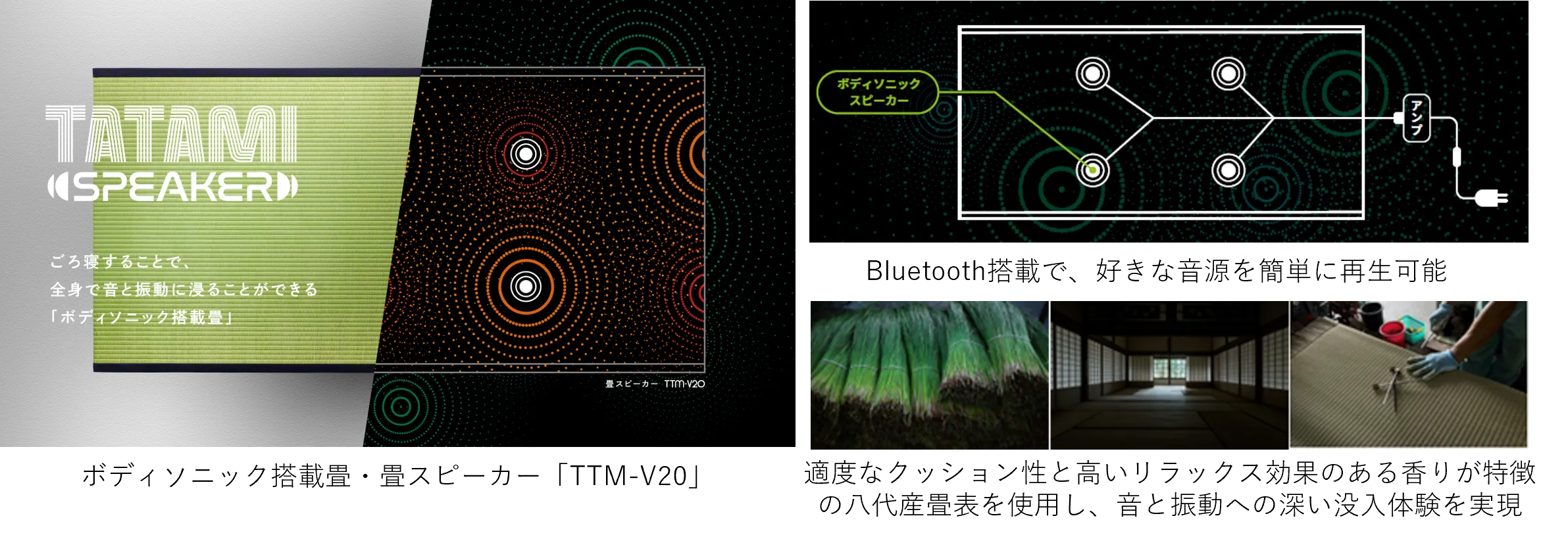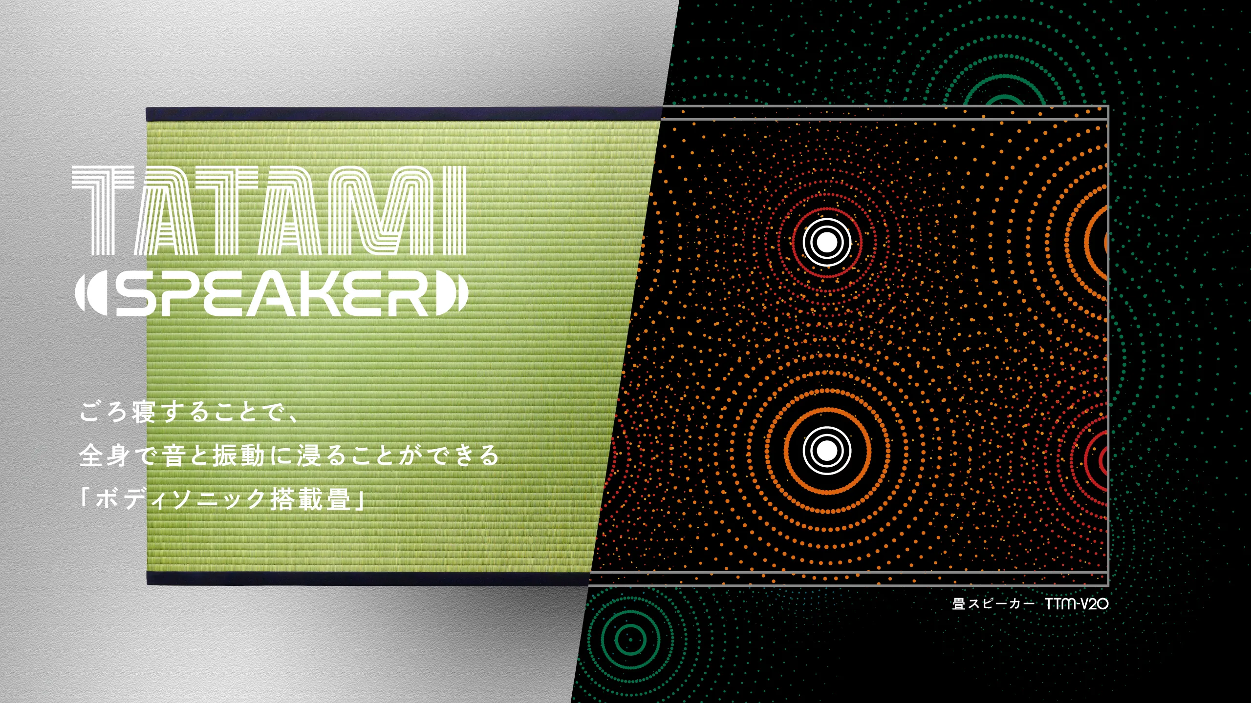 『畳スピーカー「TTM-V20」』は振動スピーカーを畳の内部に4基搭載し、畳に「ごろ寝」をすることで、全身で音と振動に浸ることができる“ボディソニック搭載畳”です。畳と接触した身体の部位から音の振動を感じることができ、その目的に合った音源を作ることで、休憩所等でのリラックスシーンから、迫力ある音楽や映像作品の鑑賞まで、さまざまな用途での活用が可能なプロダクトです。