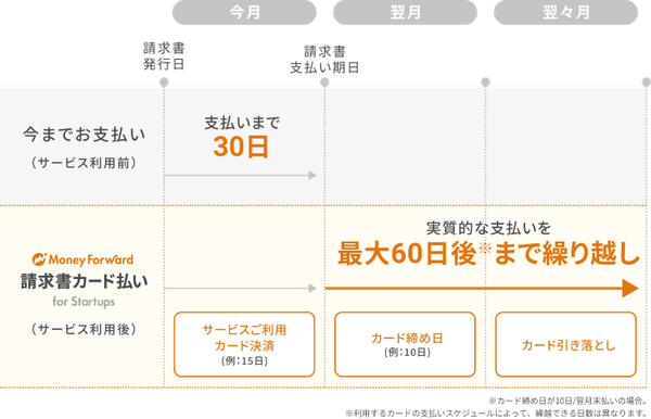 『マネーフォワード 請求書カード払い for Startups』は、銀行振込指定の請求書をカードで支払いできるようにするサービスです。クレジットカードで支払うことで、実質的な支払いをカードの利用金額引き落とし日まで先延ばしできるようになり、資金繰り改善をサポートします。