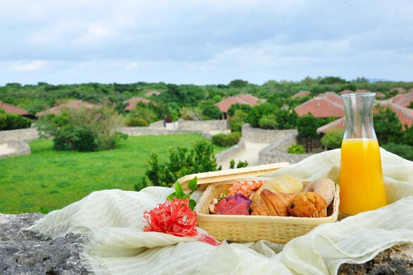 施設内の南東に位置する見晴台は、赤瓦屋根の客室、白砂の小路、客室を取り囲む石垣など、島の原風景を踏襲した客室群を眺めることができる場所です。反対側には、朝日が昇るアイヤル浜も見え、海から通り抜ける風を感じることができます。朝の心地よい時間を過ごすのに適した見晴台で朝食を提供します。5種のパンと紅芋や車エビなど沖縄で親しまれている食材を使用したおかずを詰め、フルーツジュースが付いた朝食です。施設全景を見渡しながら、朝の日の光と海からの風を浴び、一日の始まりを爽やかに過ごせます。