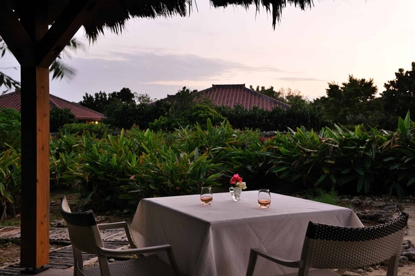 島の植物が育つ畑の中にある東屋で、夕暮れ時の風を感じながら、食前酒を飲み、食事前の時間を過ごします。食前酒は、赤紫蘇を使用した程よい酸味がアクセントのドリンクです。薄暮の空を眺めながら肌をなでる穏やかな風に癒されたあと、ダイニングでディナーコースを楽しみます。