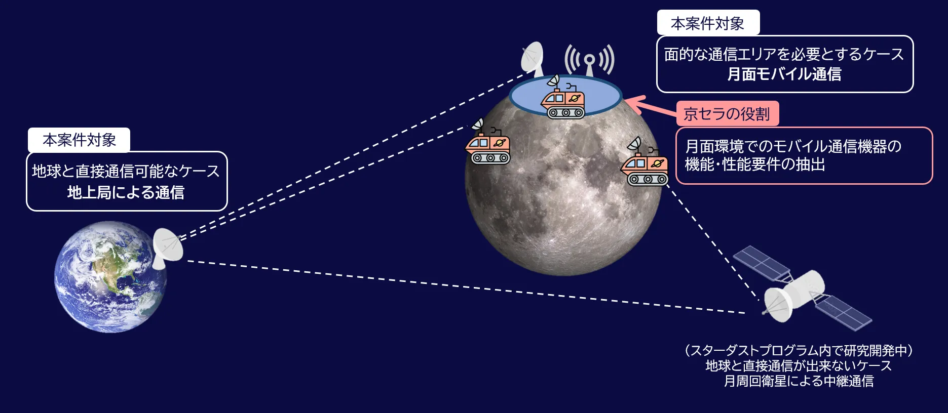 このたびの「月-地球間通信システム開発・実証(FS)」では、代表機関KDDIおよび各連携機関とともに、月-地球間および月面での大容量通信実現に向けた可能性を検討してまいります。京セラは、長年培ってきた通信機器・通信インフラ技術を活用し、過酷な月面環境で使用可能なモバイル通信機器の機能・性能要件の抽出を実施してまいります。