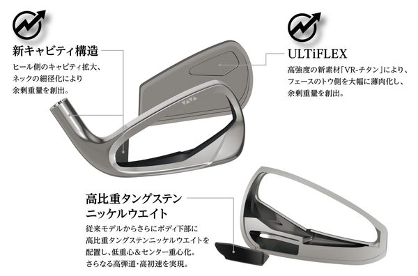 高強度の新素材「VR-チタン」を搭載した「ULTiFLEX」により、フェースのトウ側を大幅に薄肉化。ヒール側のキャビティを拡大し、ネック径を細くした「新キャビティ構造」と合わせ、余剰重量を創出。あわせて「高比重タングステンニッケルウエイト」を従来モデル※よりさらにボディ下部に配置することで低重心&センター重心化し、さらなる高弾道・高初速を実現しました。
