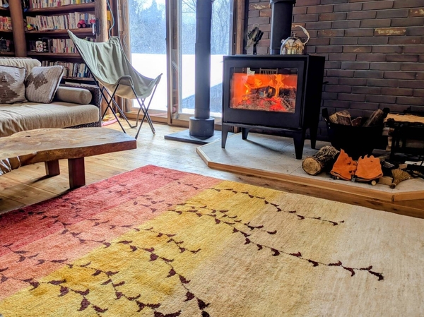 遊牧民のラグ「ギャッベ絨毯」を、薪ストーブのある古民家宿で実際に見て触れて、暖かさを体感してください!