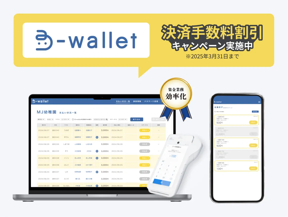 MJはSBPSの決済サービスと連携し、保育業界のキャッシュレス化を推進するためのソリューション「B-wallet」の提供を2024年11月に開始しました。「B-wallet」は、保育施設において現金を一切取り扱わない環境を実現するために開発されました。事業者は自社システムに「B-wallet」を連携することで、請求と入金の突き合わせ業務の一元化や、保護者への通知、未入金先への自動催促などができ、業務の効率化が図れます。