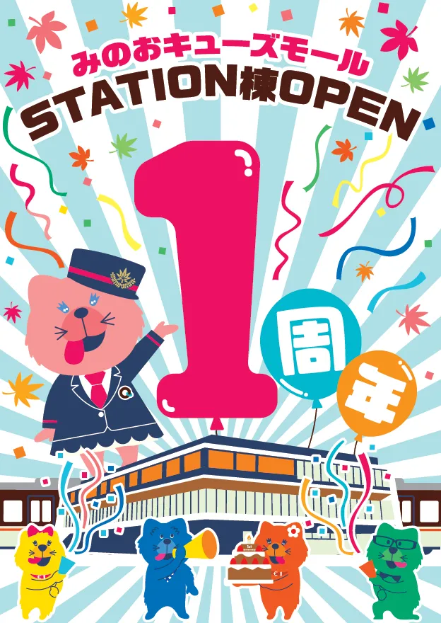 「みのおキューズモールSTATION棟」は地域の皆様に支えられながら、無事1周年を迎えることができました。STATION棟がこの先何年にもわたって地域の人に愛され、人々がつどい、共に育っていく場所でありたいという願いと、お客様への日頃のご愛顧に感謝の気持ちを込めて1周年を記念したイベントを実施します。