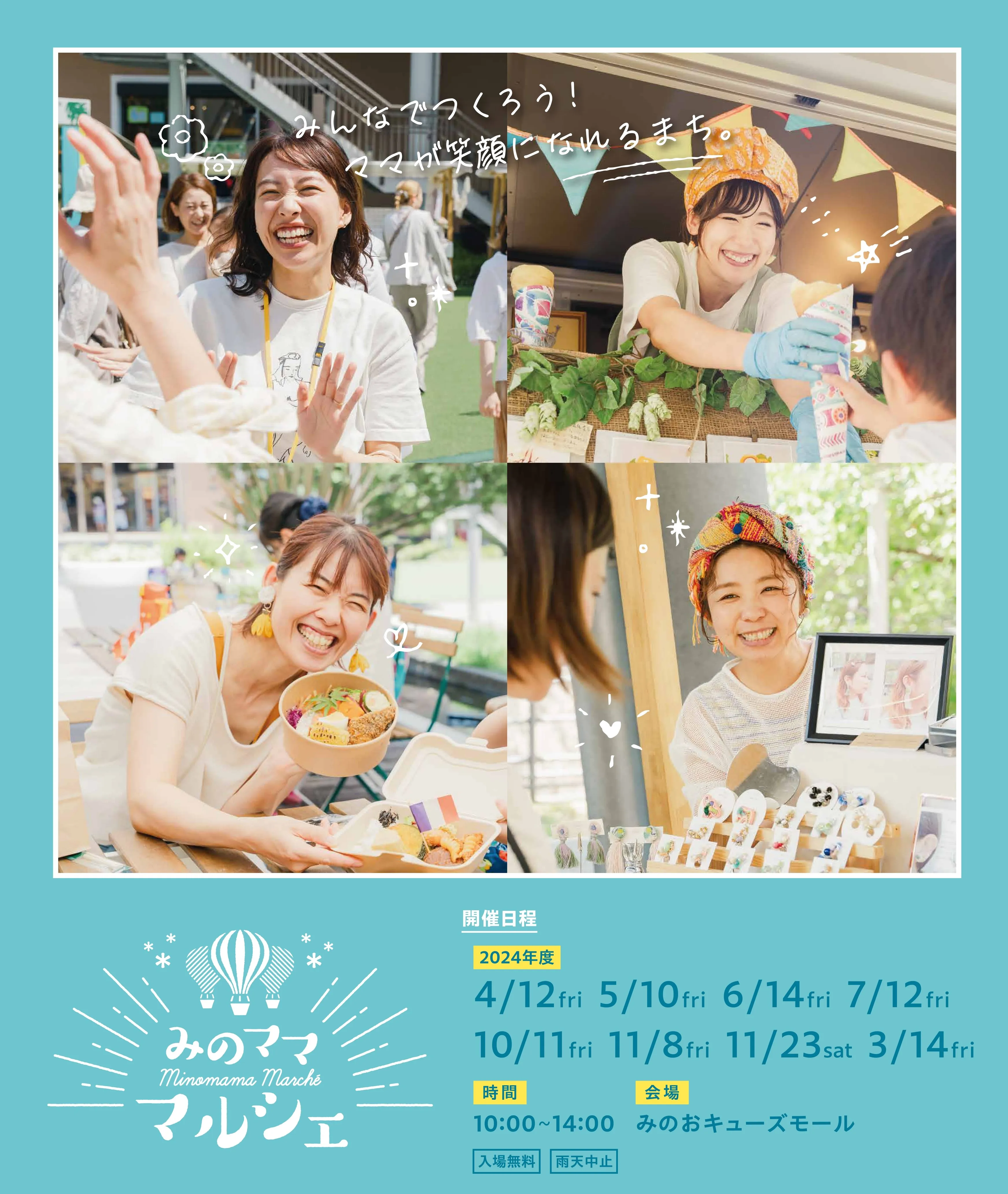 内容:みのマママルシェは、地域の子育てママが笑顔になれるまちづくりをコンセプトに、みのおキューズモールとみのおママの学校がコラボレーションし開催しています。自分たちが大好きなことでママを応援したい出店者さんと地域のママたちが笑顔でつながる最高の日をお楽しみ頂けます。