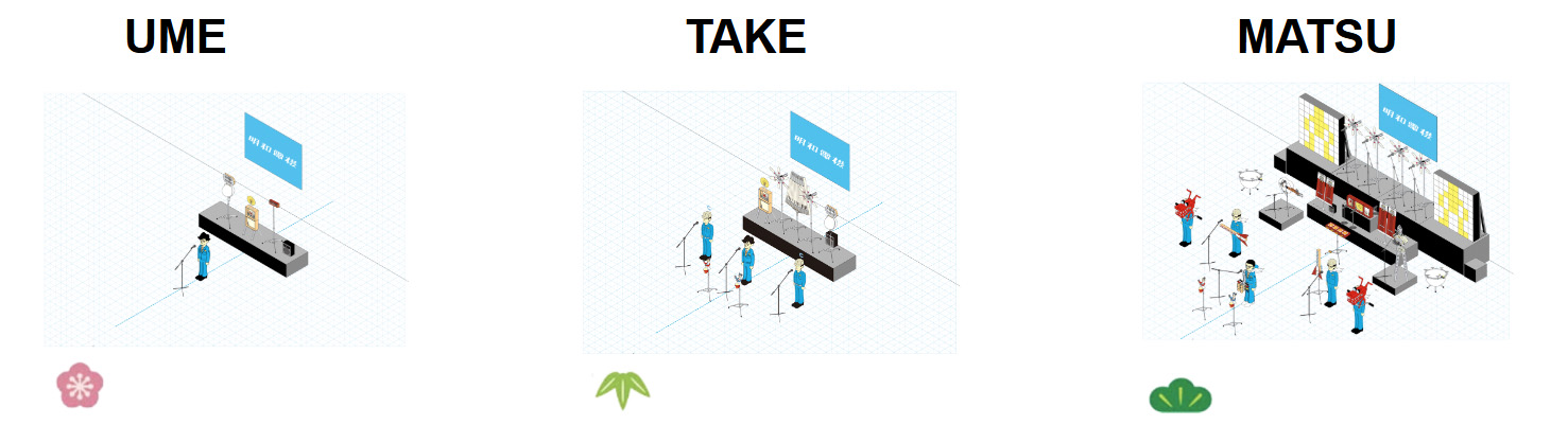 明和電機のライブコンサートはその規模にあわせて「松(MATSU)、竹(TAKE)、梅(UME)」に分かれます。
