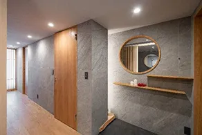 玄関を開けると、控えめな飾り棚とゆとりある土間空間がゲストを迎えます。奥まで見通せない廊下は、京都の風情ある路地のような造りとなっています。木とタイルの素材感を活かした廊下は、間接照明で上質な雰囲気を演出し、障子戸から漏れる柔らかなあかりが次の空間への期待感を高めます。