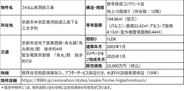 阪急阪神不動産株式会社では、一住戸単位での物件取得からリノベーション、施工管理までトータルプロデュースする買取再販事業『Styles』を推進しています。この度、「フォルム東洞院三条」の一室(以下、本物件)において、多拠点生活を提案するリノベーションを行い、2月6日(木)より販売を開始しました。