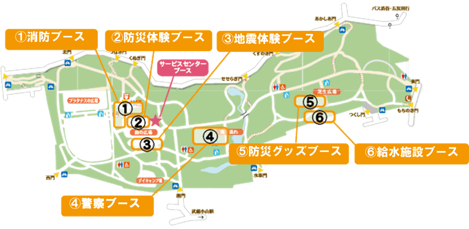 消防車の乗車体験ができるブースや地震を体験できるブースなど、楽しく防災を学べる様々なブースをご用意して皆さまをお待ちしております。また各ブースでミッションを達成してスタンプを集めていただくと、先着500名様に公園オリジナル缶バッチなどのグッズをプレゼントします!