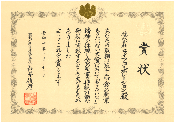 令和6年度『第12回食品産業もったいない大賞』でライフコーポレーションの 「持続可能で豊かな社会の実現に貢献する食品廃棄物削減の取り組み」が『農林水産省大臣官房長賞』を受賞!