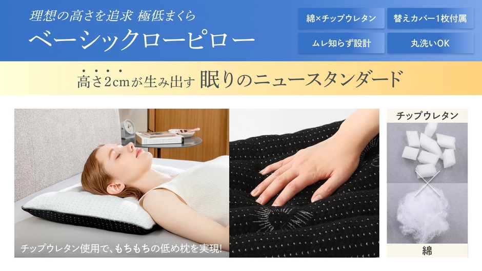 「色々な枕を試してもしっくりこない」そんなお悩みを抱える方に最適な枕が新登場いたします。わずか2cm*の薄型設計が首や肩への負担を軽減し、どんな寝姿勢でも快適な眠りを提供します。ふんわりとした綿に耐久性のあるチップウレタンを加え、通気性を向上させながら長期的にご使用いただける設計です。付属のストレッチ素材の替えカバーは肌触りが良く、洗濯のサイクルもサポートいたします。