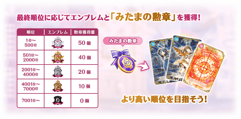 イベント終了後の集計で確定した最終順位に応じて、エンブレムと「みたまの勲章」が獲得できます。