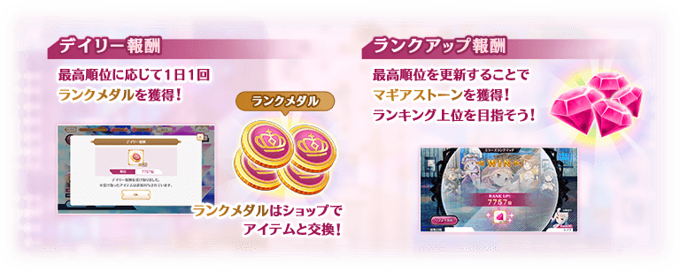 本イベントの期間中、自身の最高順位を更新することで、期間限定ショップで使用できる「ランクメダル」やマギアストーンが獲得できます。