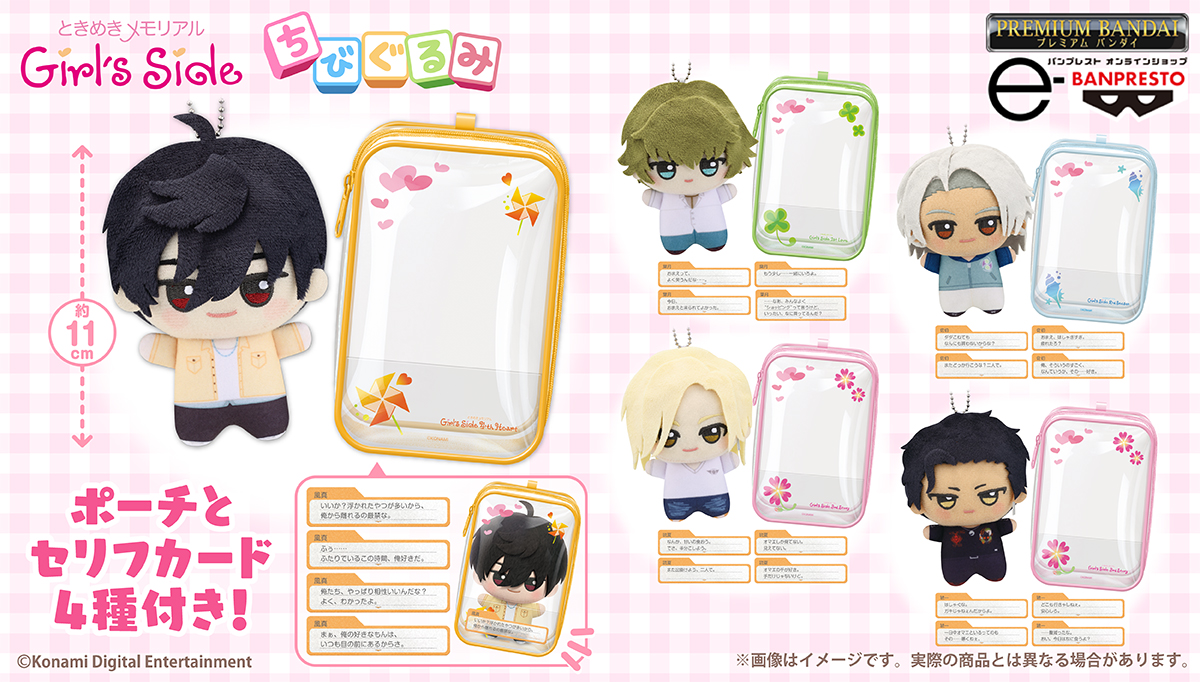 株式会社コナミデジタルエンタテインメント(本社:東京都中央区、代表取締役社長:早川 英樹)の学園恋愛シミュレーションゲーム「ときめきメモリアル Girl's Side」シリーズの全4タイトルから、5人の男の子が『ちびぐるみ』で登場!デートをイメージした、ちびぐるみとポーチとシチュエーションの異なるセリフカード4種のセット商品♪『ちびぐるみ』をポーチに入れて、いろいろなところに出かければ、まるでゲームの中のようにカレとのデートを追体験できます。