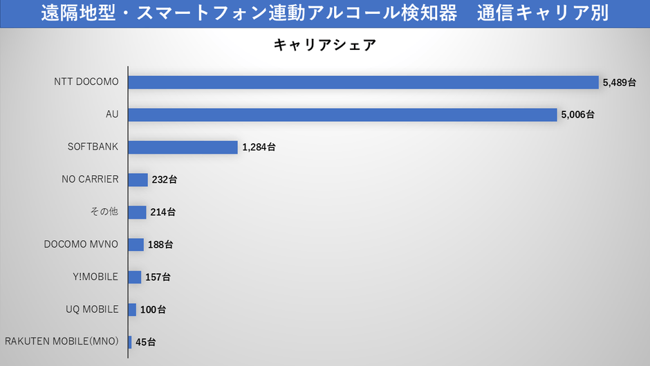 遠隔地型・スマートフォン連動型アルコール検知器の導入実績と通信キャリア別・端末別スマートフォンの使用状況を公開
