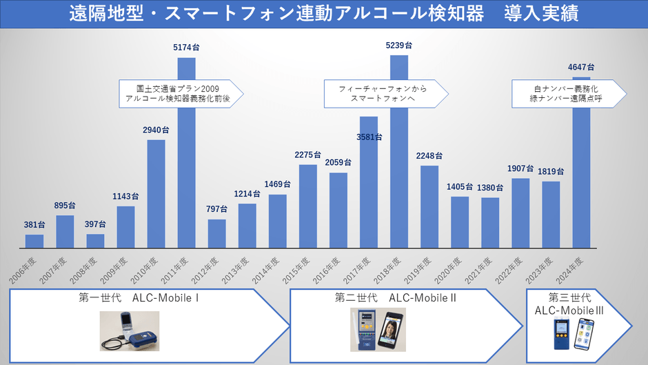 2020年度以降、新型コロナウイルスによる旅客事業者様の苦境による投資抑制、白ナンバー義務化による同業他社との価格競争により実績がやや低迷しましたが、2023年の第Ⅲ世代 ALCMobileⅢの市場投入や2024年の貸切バスのデジタル点呼法令により、2024年度は前年比200%以上増、4,000台を超える実績となりました。