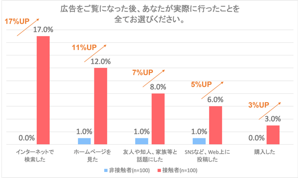 広告接触により、商材の認知、利用意向の向上に寄与し、特に広告認知が大幅にリフトアップ。