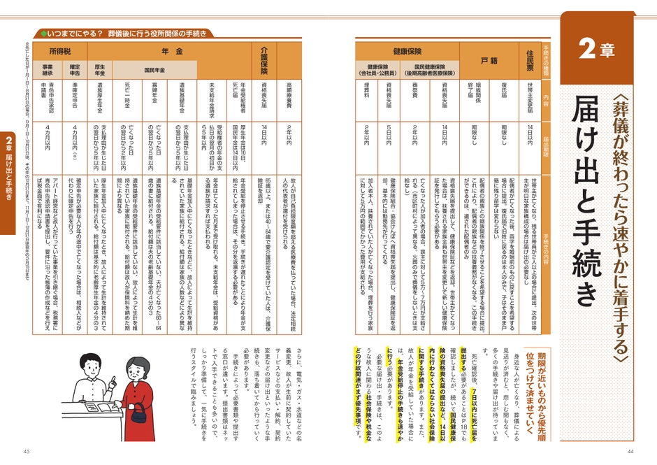 4大手続き「葬儀と法要」「役所への届け出」「遺産相続」「お墓」の流れとポイントが一目でわかる図解とタイムスケジュール表に、とじ込みブックでは最新の「おひとりさまの終活と手続き」も紹介。