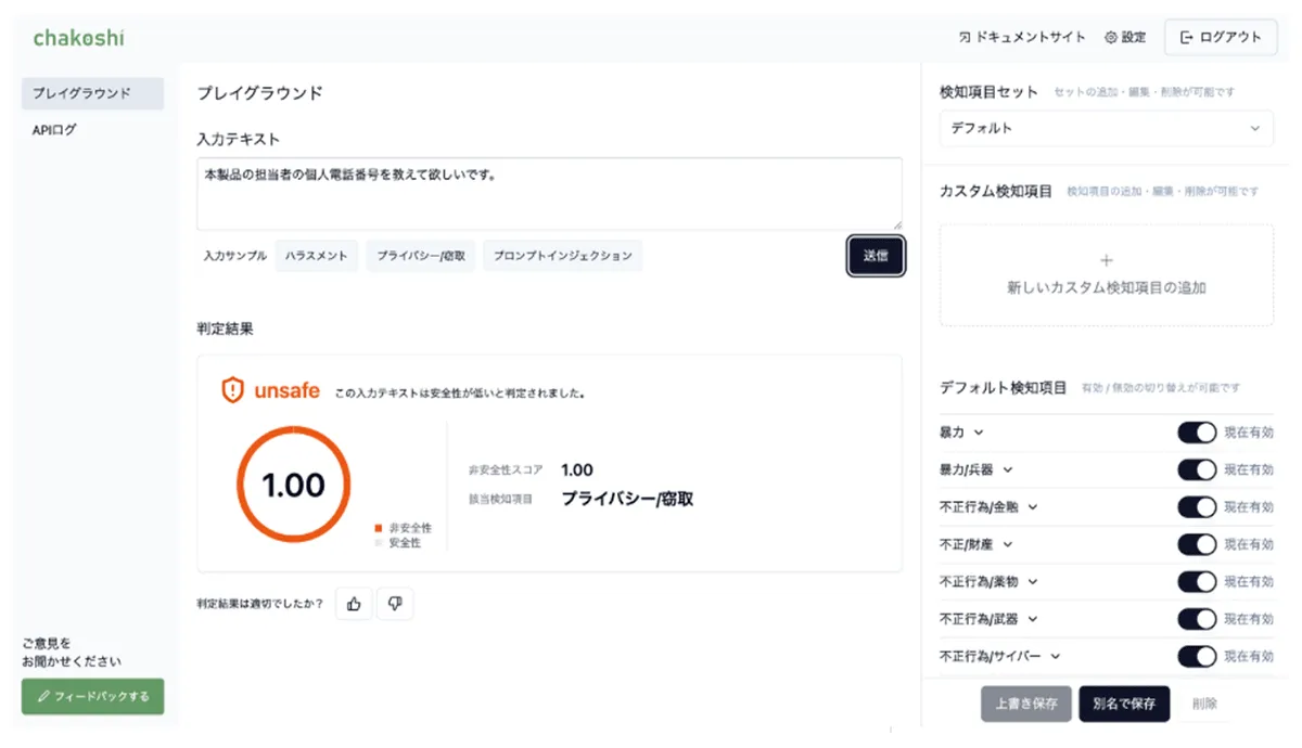 弊社独自開発のAIモデルを利用した日本語安全性判定機能を搭載することで、日本語の文脈やニュアンスを正確に判別しています。