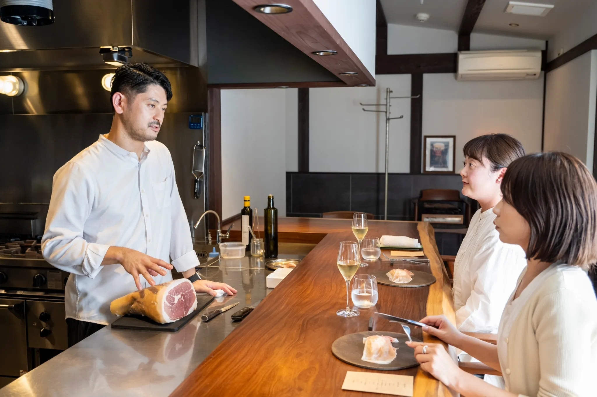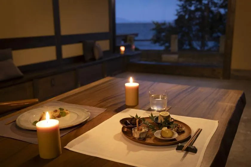 福田屋に宿泊するプランでは、月の明かりと高島で造られた和ろうそくのゆらめきで過ごす滞在時間を楽しむことができます。シェフが1組のゲストのためだけに素材を厳選し心をこめて提供する観月ディナーとデザートをお楽しみください。