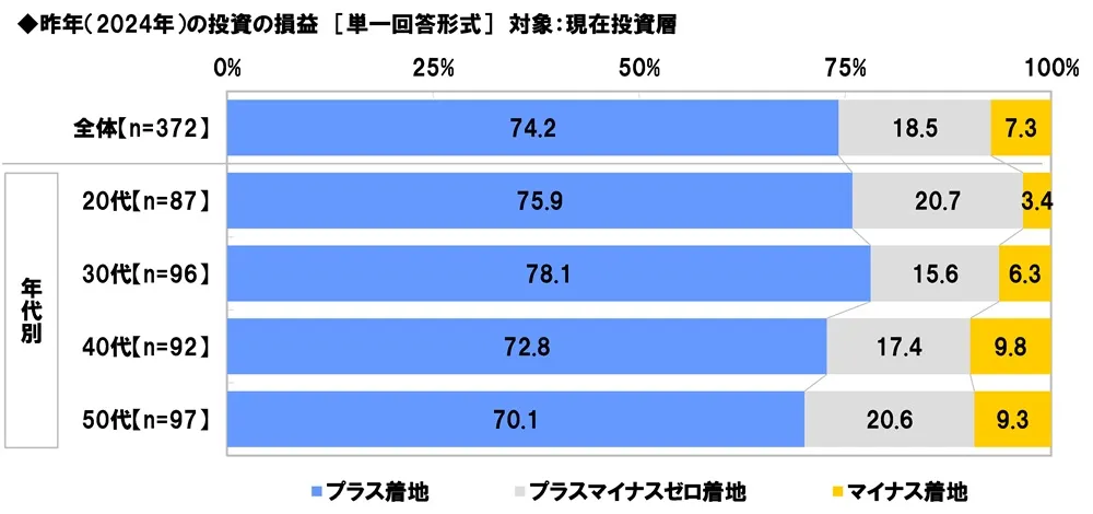 現在投資層(372名)に、昨年(2024年)の投資の損益を聞いたところ、「プラス着地」は74.2%、「プラスマイナスゼロ着地」は18.5%、「マイナス着地」は7.3%と、投資で利益が出た人が大半となりました。