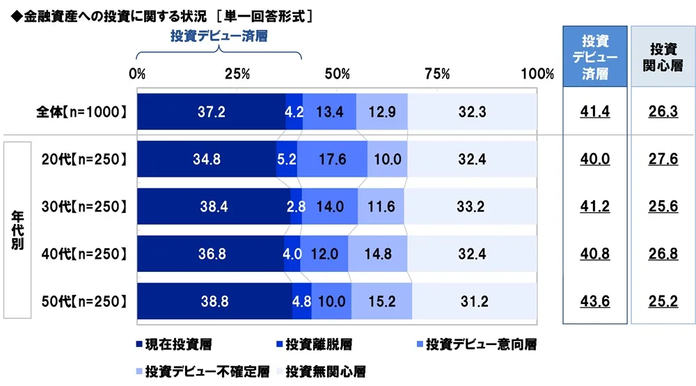 全回答者(1,000名)に、金融資産への投資に関する状況を聞いたところ、現在投資をしている「現在投資層」が37.2%、以前投資していたが、現在はしていない「投資離脱層」が4.2%で、合計した『投資デビュー済層』は41.4%となりました。また、投資に興味があり、投資を始めたいと考えている「投資デビュー意向層」が13.4%、投資に興味があるが、投資を始めるかどうかはわからない「投資デビュー不確定層」が12.9%で、合計した『投資関心層』は26.3%、投資に興味はない「投資無関心層」は32.3%となりました。