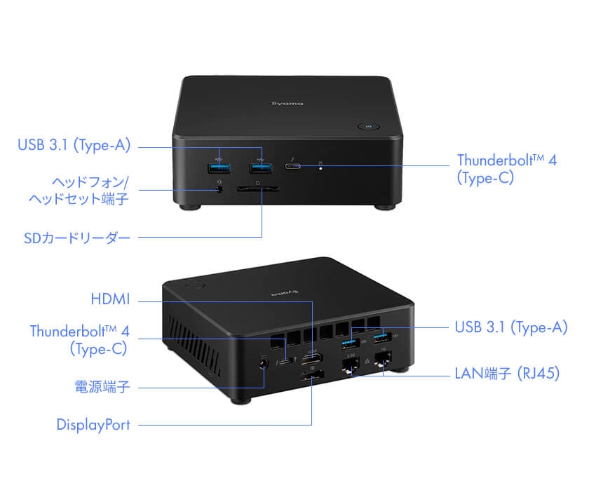 USB3.1(Type-A)×2、Thunderbolt™ 4(Type-C)×1、HDMI×1、DisplayPort×1、LAN(RJ45)×2、電源端子